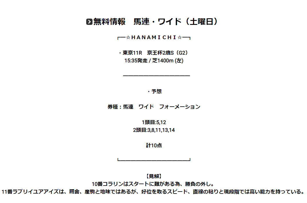 まぁワイド予想ならコラリンが馬券内に来てもまだ当たるチャンスありますし、ワイド予想は保険込みの何者でもない予想ですね。