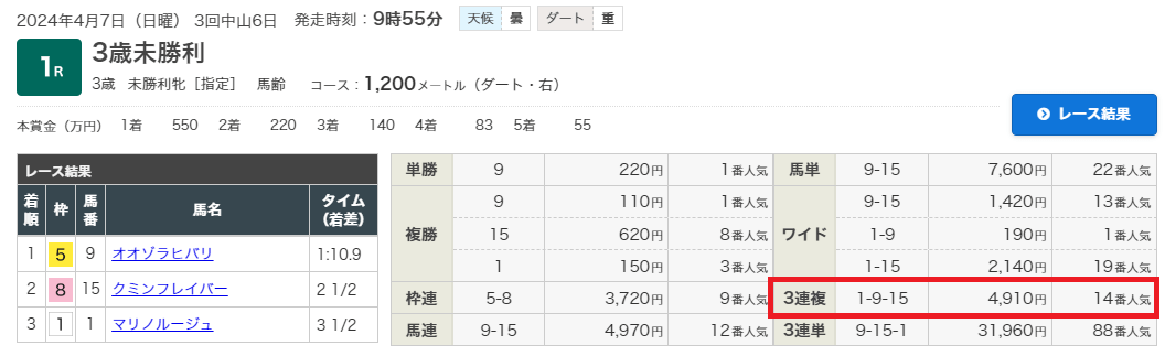 4万9100円(中山1R)+9万1800円(阪神1R)=合計14万900円獲得!
