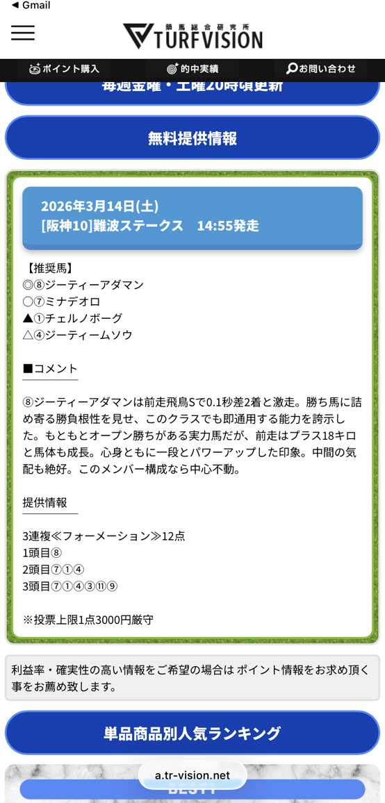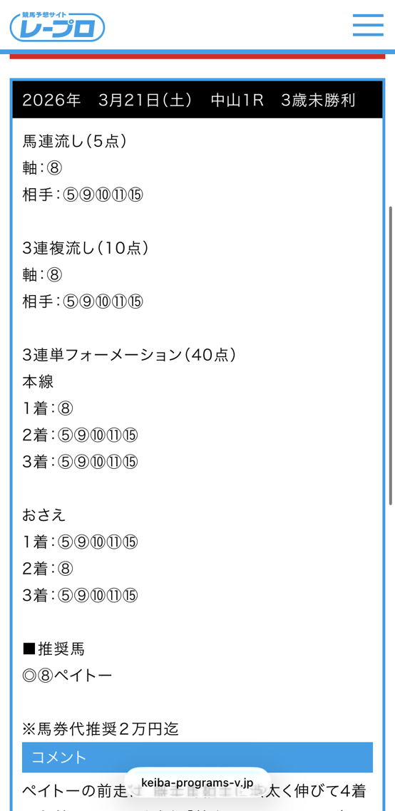 このサイトの点数を絞ったのと、圧張り予想が好きでよく多様しています、先週も安定の7万4700円的中で満足のいく結果をもらえました。 今週は3連休で出かけるから、旅先でターフビジョンの予想を使いつつ遊び金を臨時収入として掴みたいと思います。