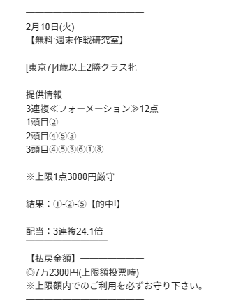 このサイトの点数を絞ったのと、圧張り予想が好きでよく多様しています、先週も安定の7万4700円的中で満足のいく結果をもらえました。